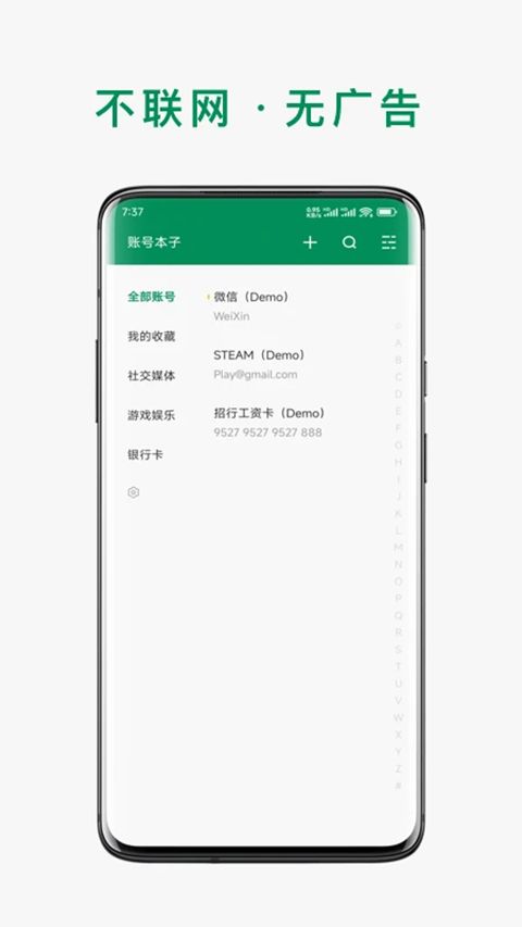 账号本子app是一款非常实用的手机办公软件。该款软件在在功能上为用户们提供来的是账号密码的保存工作,其中在信息的安全方面制作的还是蛮可靠的,软件采用的是AES256等加密算法混合加密而得到,只有用户们输入了正确的密码才能得到想要的数据哦,且软件是禁止网络本地保存的呢,这无疑大大的提高了信息的安全性。对这款软件感兴趣的小伙伴们或者有这方面需求的朋友们,欢迎大家免费下载体验。