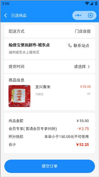 4、可选择提货时间和联系站点,货物只支持门店自提,提交订单