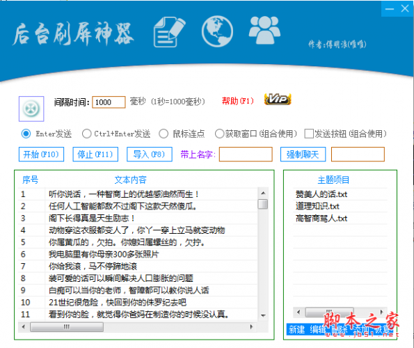 唯唯后台刷屏神器是一款强大好用的后台自动骂人工具。用户只需要开启唯唯后台刷屏神器即可自动骂人,软件支持自定义导入骂人的内容和设定时间间隔等,还可以导入图片发送表情等,用过这款软件的小伙伴一定会喜欢这款软件的,欢迎有需要的小伙伴来下载使用...