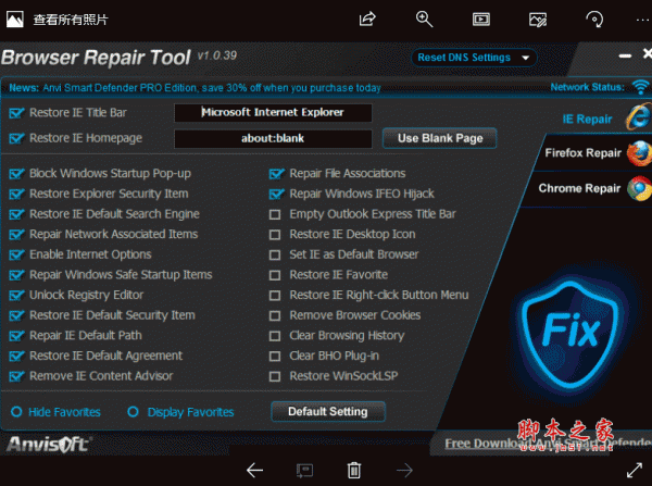 Anvi Browser Repair Tool是一个免费的浏览器修复工具,支持众多与网络和浏览器相关的修复选项。包括主页修复、标题栏、DNS设置、BHO插件等等...