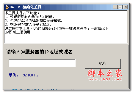 这是某个OA系统提供的IE初始化工具,通用于所有OA办公系统和IE浏览器,执行本工具后,OA的IE端基础环境将一键设置完毕,一般情况下,OA即可正常使用...