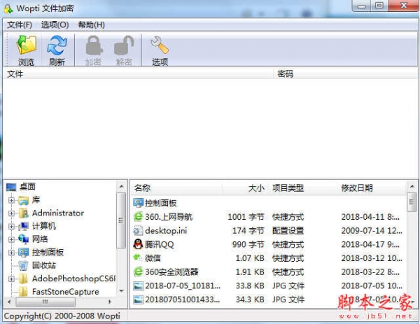 wopti文件加密是一款非常有用的文件加密软件,软件绿色小巧,无需安装即可使用。能够帮助用户将电脑上的各种文件以及文件夹进行加密处理,极大程度保护用户电脑的隐私安全...