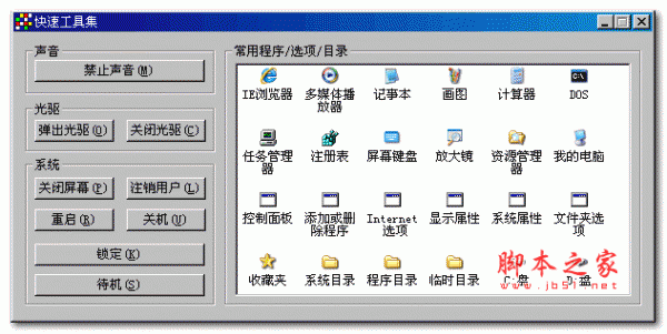 快速工具栏,把一些常用的系统程序和系统功能集中在一个界面里,方便用户快速启动相应的程序或功能,比如快速静音、弹出/关闭光驱、关闭显示器、快速关机、锁定计算机、打开控制面板等...