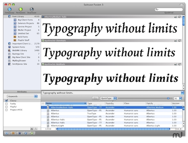 Suitcase Fusion 5 Mac版是一款可以在苹果电脑Mac os平台上使用的Mac字体管理工具,Suitcase Fusion 5可以帮助你管理你电脑上所有的字体,不管是你下载的,还是你自己制作的,都能全面的覆盖,还带有字体预览功能...